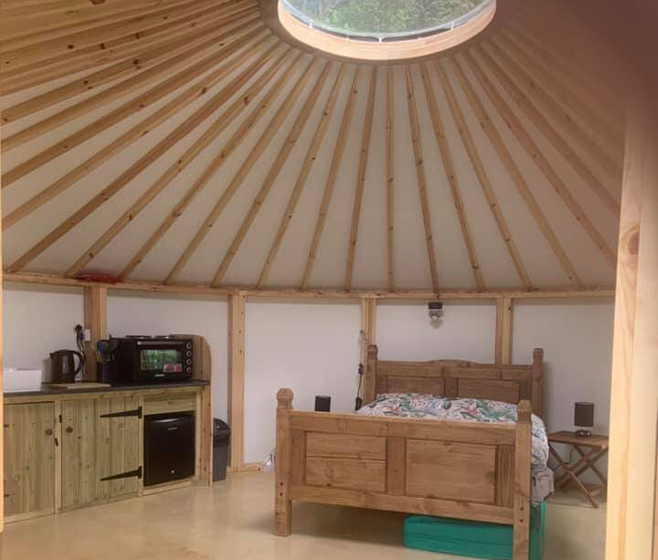 The Roundhouses are beautiful, wooden-clad structures, sleeping 4. They differ from the traditional yurt in that they have a fully equipped kitchen, including gas hob and fridge and their own cloakroom facilities.